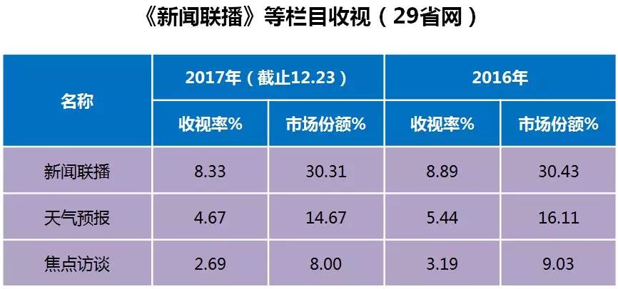 2017年,《新聞聯播》全國并機收視率8.33%,份額30.31%,維持高位運行。《天氣預報》收視率4.67%,《焦點訪談》收視率2.69%。三檔節目收視份額相加達到53%,說明在每天19:00-20:00的黃金時段中,全國有一多半的人在收看中央電視臺的節目。