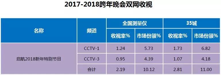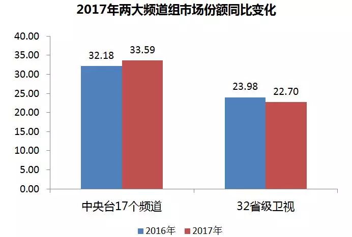 2017年,中央電視臺整體份額達33.59%,比2016年提升1.4個百分點。在全國網上星頻道收視份額排名前十中,央視獨占七席;在35中心城市上星頻道收視份額排名前十中,央視占據六席。央視更是包攬了雙網前四名。