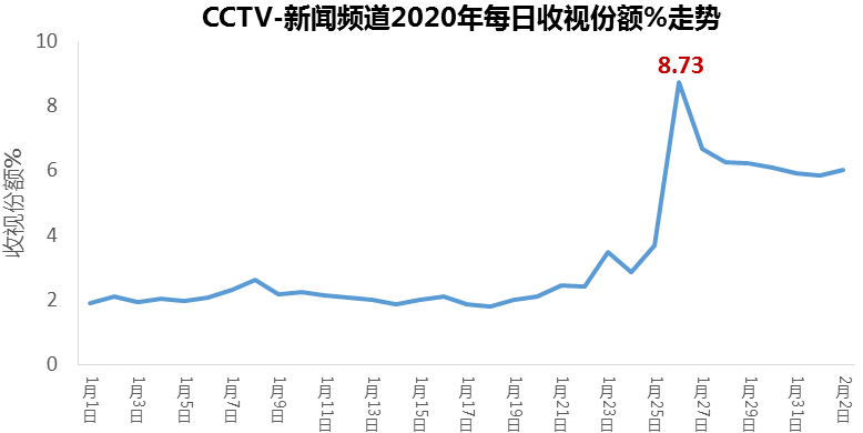 此外,CCTV-新聞頻道《共同關注》全國網收視率沖至1.76%,《東方時空》收視率達1.63%,《新聞30分》收視率達1.48%。此外CCTV-新聞頻道特別節目《戰疫情特別報道》在1月26日收視率達4.57%、收視份額19.87%,觀眾規模超過1.2億。