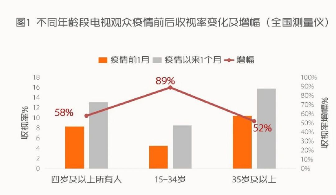 作為一個具有60年歷史的媒體形態(tài),電視成熟穩(wěn)重,相伴守候,是老少咸宜、雅俗共賞的大眾媒體。疫情之下,年輕群體成為主動回歸電視大屏的中堅力量,引領(lǐng)特殊時期收視市場新的變化和風(fēng)向。CSM全國網(wǎng)數(shù)據(jù)顯示,疫情以來,電視媒體各年齡段觀眾的收視率均明顯上升,15-34歲年輕觀眾收視率增幅高達(dá)89%。特別是央視新聞欄目,年輕觀眾收視率上漲超過400%,大學(xué)以上學(xué)歷觀眾收視率上漲高達(dá)342%。