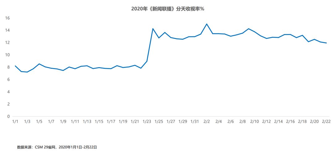 《新聞聯播》是每天的收視巔峰,新冠肺炎疫情發生以來更是收視大漲,從8%左右躍升至12%左右,體現“有大事,看總臺”的主流媒體引領力、傳播力、影響力。從分天收視率來看,《新聞聯播》2月單期最高收視率高達15.03%,單期最高份額高達45.14%!