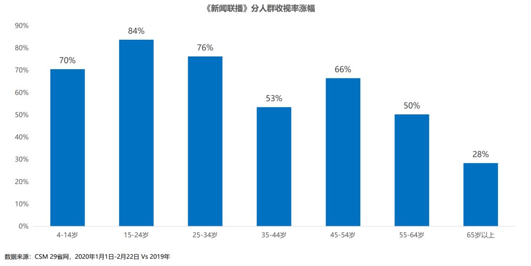 2020年初,《新聞聯播》各年齡段觀眾均上漲顯著,尤其是年輕觀眾回歸趨勢明顯。較之2019年,《新聞聯播》15-24歲的觀眾漲幅高達84%,為各年齡段觀眾漲幅之最;25-34歲觀眾漲幅第二高,達到76%。