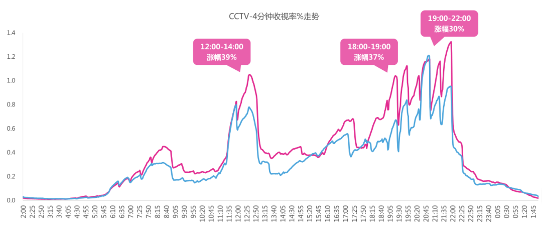 CCTV-4全天各時段收視率上漲,其中午間、傍晚和黃金時段均提升30%以上。