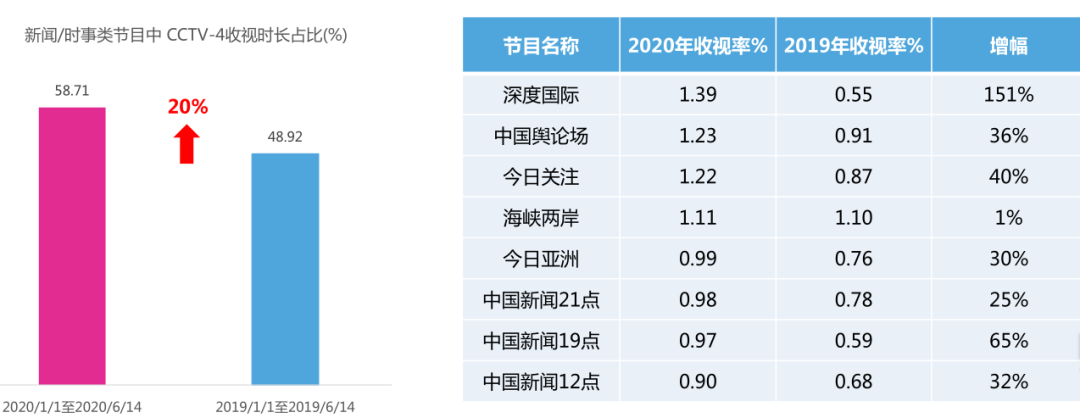 新聞類節目收視時長占比提升20%,《深度國際》《中國輿論場》《今日關注》《中國新聞》等主要節目收視增幅明顯。