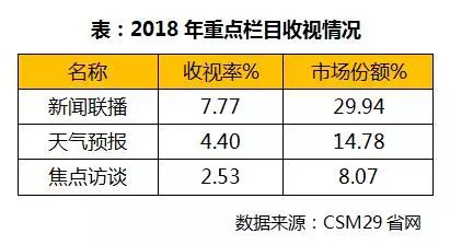 2018年截至12月15日,《新聞聯(lián)播》收視率7.77%、份額29.94%,《天氣預(yù)報(bào)》收視率4.4%、份額14.78%,《焦點(diǎn)訪談》收視率2.53%、份額8.07%。
