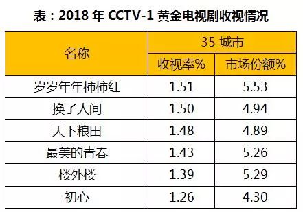 CCTV-1黃金檔電視劇雙網(wǎng)均有較好表現(xiàn),其中35城市更勝一籌,其中《歲歲年年柿柿紅》收視率1.51%、份額5.53%,獲得頻道冠軍。