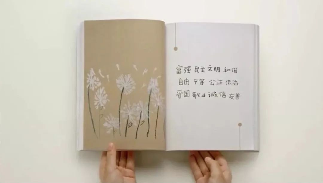 在廣告的結尾 片頭出現的小女孩蹦蹦跳跳地來到博物館 手捧一本圖畫本 紙張上用稚嫩的筆畫寫下 社會主義核心價值觀的內容 十二個詞雖然看起來簡短 但背后蘊含著 從國家、社會到個人不同層面的行為準則 社會主義核心價值觀就如同片頭的那一株蒲公英 傳揚到每個孩子的心靈深處并生根發芽 在潛移默化中伴隨著孩子們的成長
